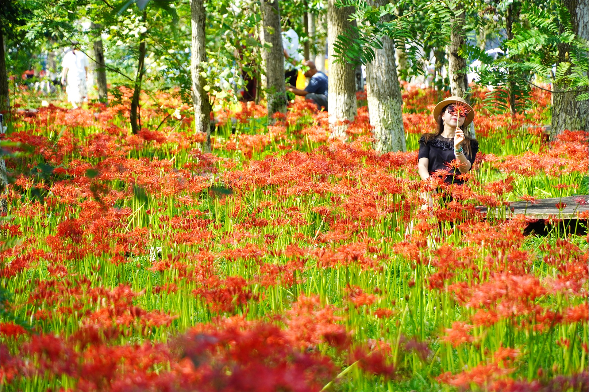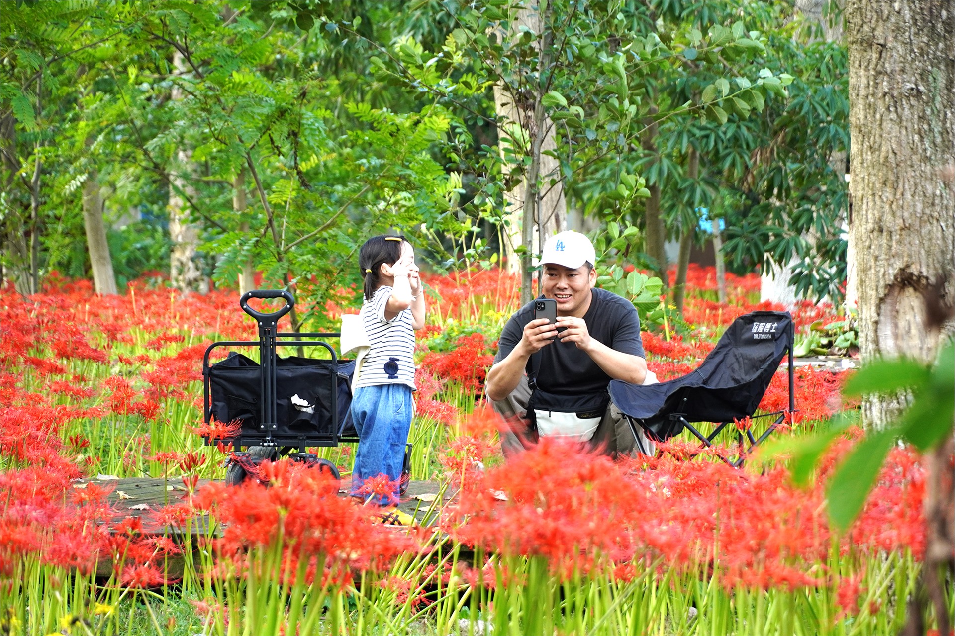 在青杨村湿地公园,彼岸花竞相绽放,将秋日的青杨村装点成一片炽烈的“红色海洋”。走进湿地,仿佛踏入一场炽热的梦境,细长的花茎顶着伞状花序,丝绸般的花瓣呈辐射状舒展,红的似火,在秋风中轻轻摇曳,与高大的白杨树、蜿蜒的木栈道构成一幅层次分明的秋日画卷。花丛间,游客们或驻足细嗅花香,或俯身轻抚花瓣,孩童们举着气球在花间奔跑,银铃般的笑声与快门声交织成曲。