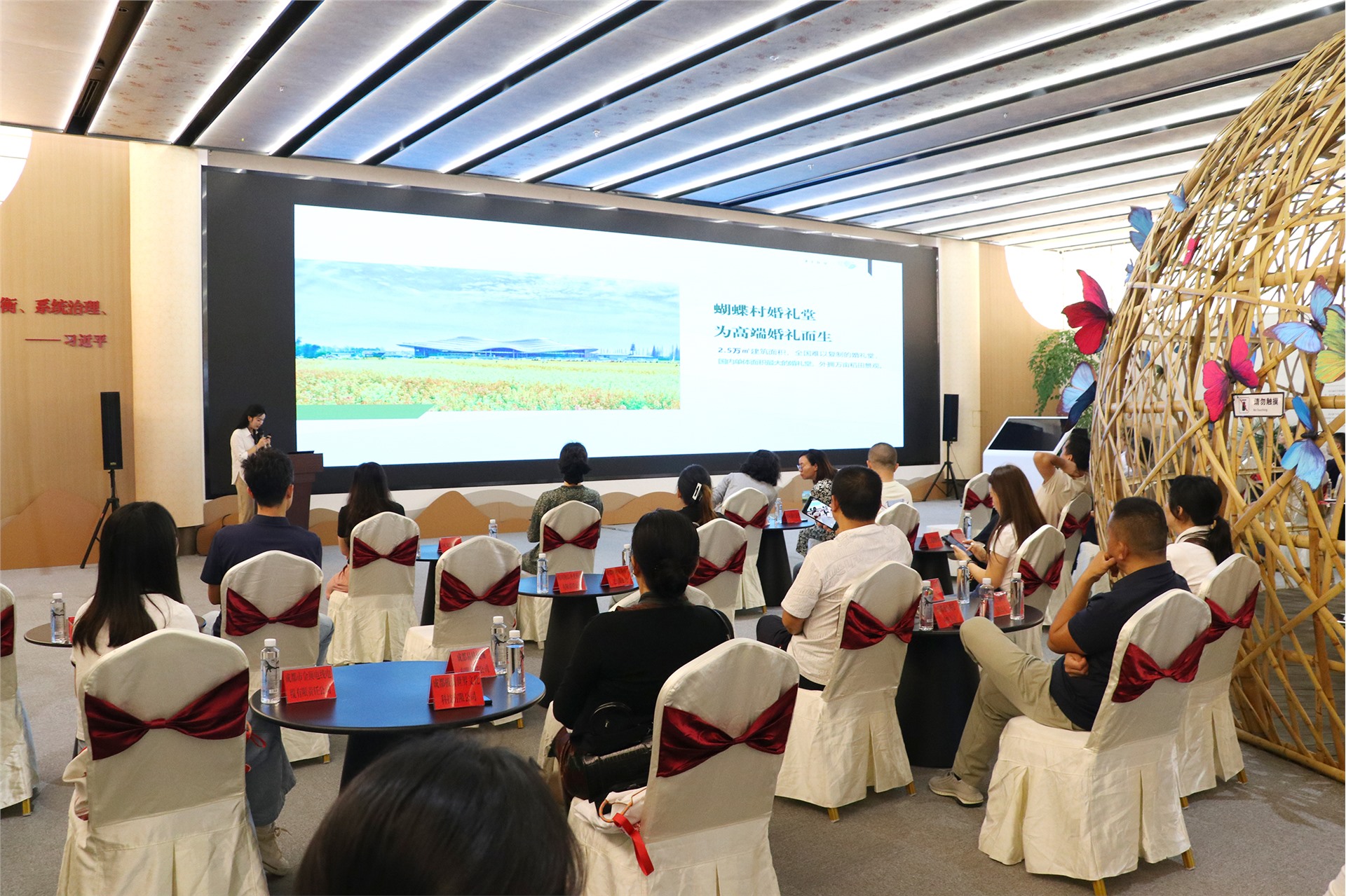 现场,云田(成都)企业管理有限公司进行了蝴蝶村项目全景推介,莳花渡酒店运营总经理介绍了民宿产品,婚礼堂销售主管则对婚恋产品进行了介绍。互动洽谈环节中,双方围绕合作细节展开了细致探讨。随后,嘉宾们还先后前往蝶语馆、莳花渡民宿、百合亭婚姻登记处等进行实地考察,深入了解蝴蝶村的项目情况。