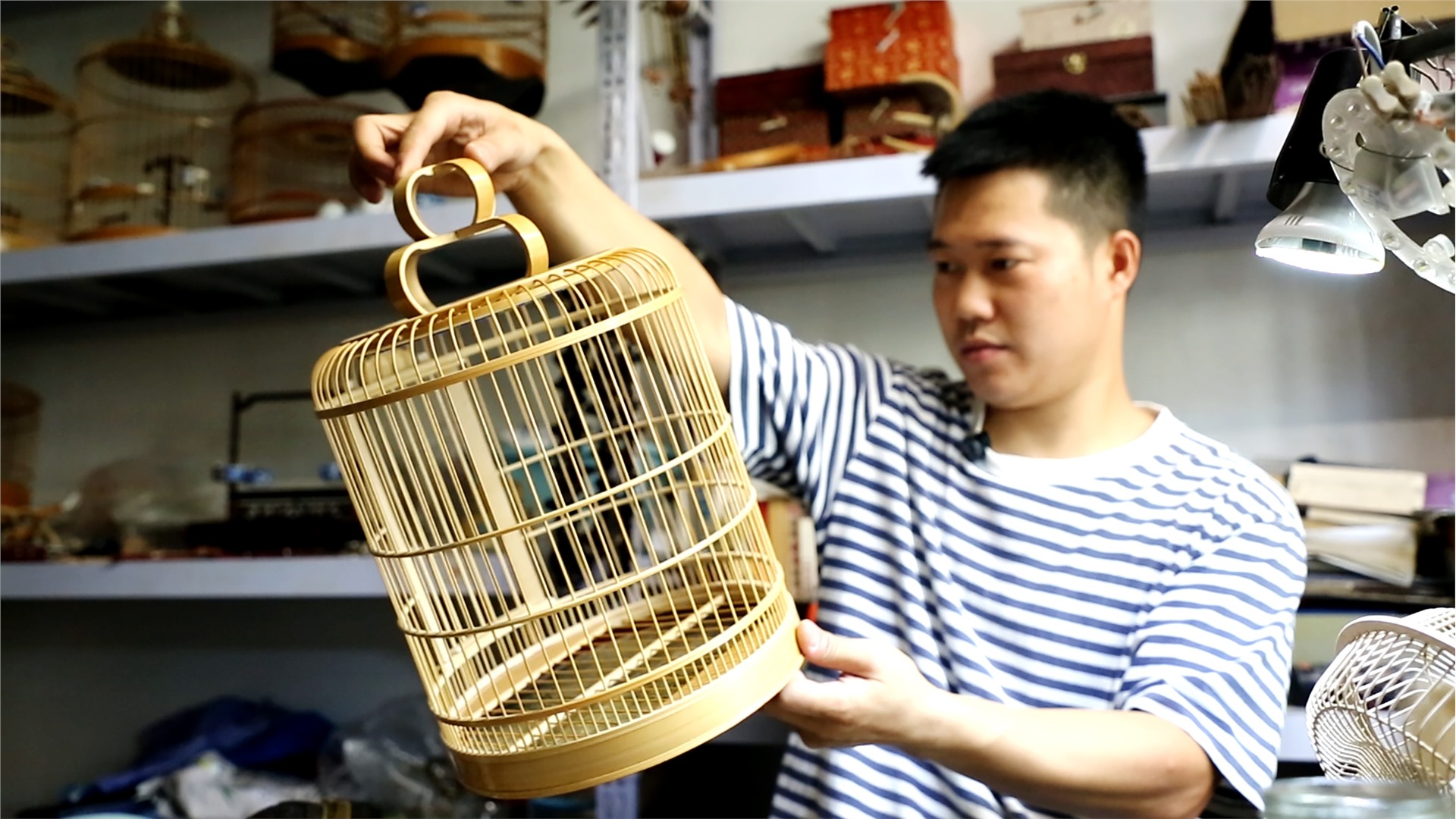 “老祖宗的东西这么好,不能只在屋里摆着。”任宇将鸟笼制作与雕刻非遗技艺相结合,他拿起定制鸟笼展示,“鸟笼内外是光洁的青皮,笼身环刻了‘万字回纹’图案。”有的鸟笼刻有“八仙过海”等神话故事图案,有的还镶嵌上温润的牛骨饰件……一件作品,融合竹编、雕刻、镶嵌多种工艺,让鸟笼成为艺术品。