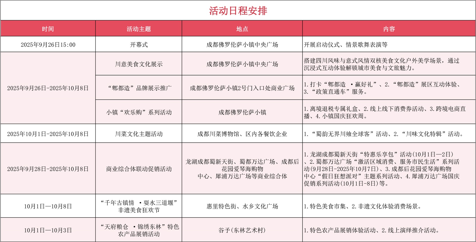 除了主会场佛罗伦萨小镇,郫都辖区的龙湖成都蜀新天街、蜀都万达广场、犀浦万达广场、成都后花园爱琴海购物中心等商业综合体也同步推出主题促销活动。此外,川菜博物馆、三道堰古镇、东林艺术村等地也将举办系列文化体验和农产品展销,形成全域联动、全民参与的节日氛围。