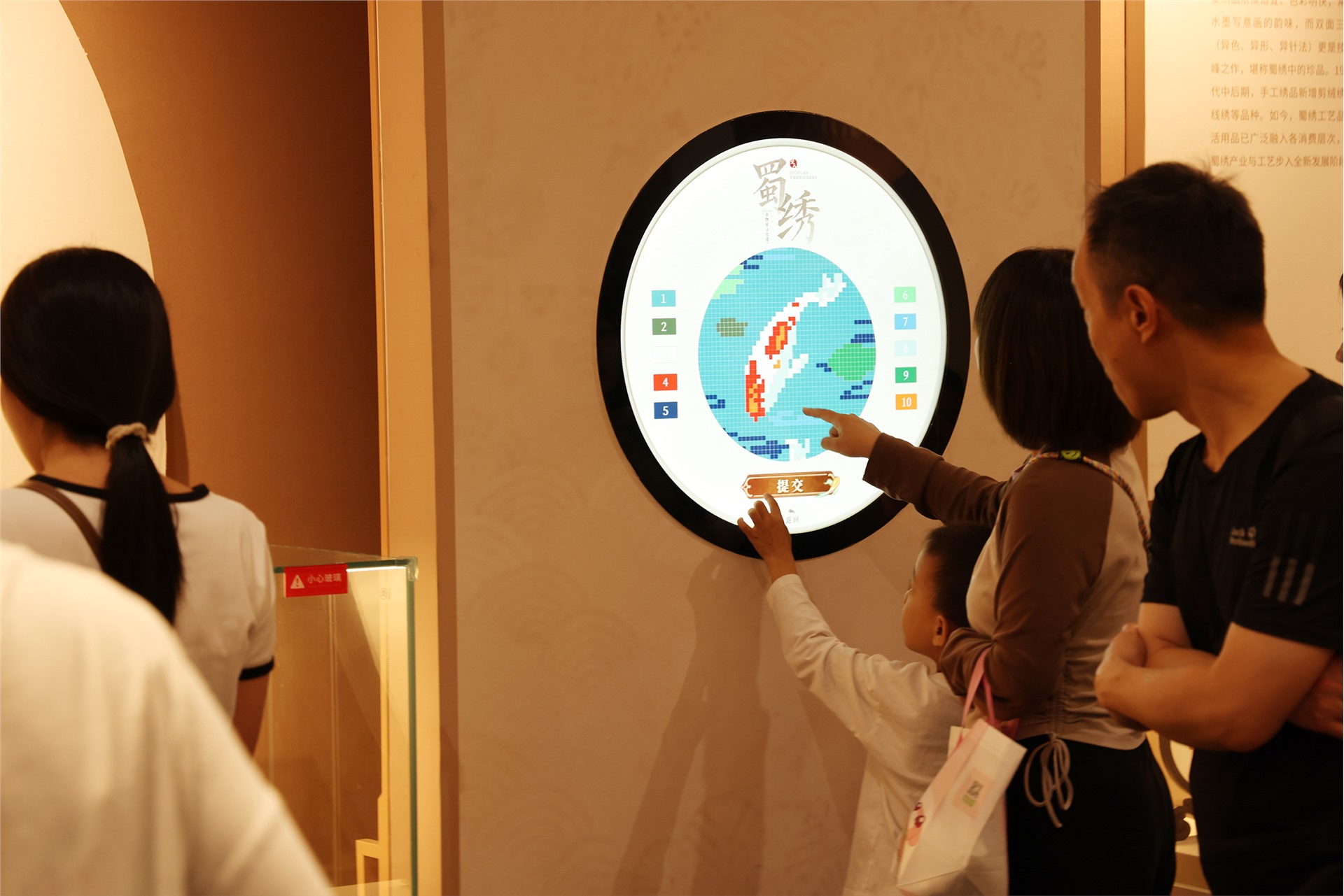 据介绍,郫都区博物馆面积约770平方米,依托望丛祠深厚的历史底蕴,馆内构建了序厅、文物展厅、非遗展厅、中庭展区、走廊展区五大核心板块。馆藏品类丰富,其中,文物展厅集中展示战国铜兵器(如蜀铭文铜戈)、汉代画像砖、说唱俑等镇馆之宝,辅以青铜器、陶俑、书画碑帖等多元藏品,勾勒出郫都从新石器时代至近现代的历史脉络;非遗展厅全面展出郫都区区级非遗项目,包括蜀绣技艺、川菜烹饪、郫筒酒酿造等活态文化,配合AR技术实现“非遗触屏体验”;中庭与走廊展区则以光影装置和场景复原重现古蜀先民生活图景,观众可漫步于仿古街巷,感受“蜀民巴适”的市井烟火。 (记者 雷茜 文/图)