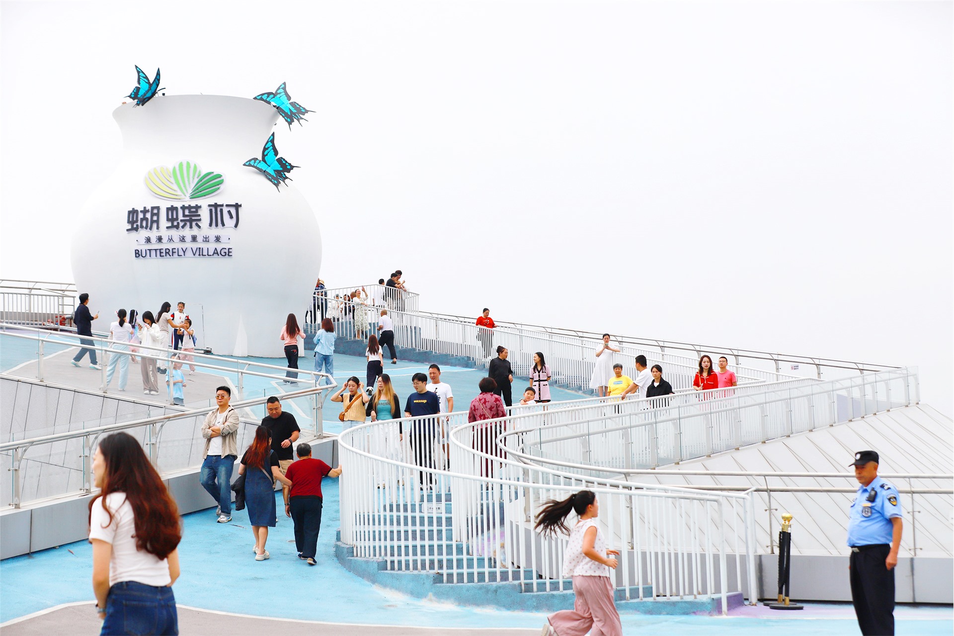 与春天花乐园相隔不远的蝴蝶村,双节期间同样人气高涨。这片总面积1.8平方公里的乡村振兴示范片区,以“北区滨水休闲+南区浪漫爱情”为核心定位,将生态美景与婚恋经济、川西民俗深度融合,成为市民逃离城市喧嚣、体验田园生活的热门之选。