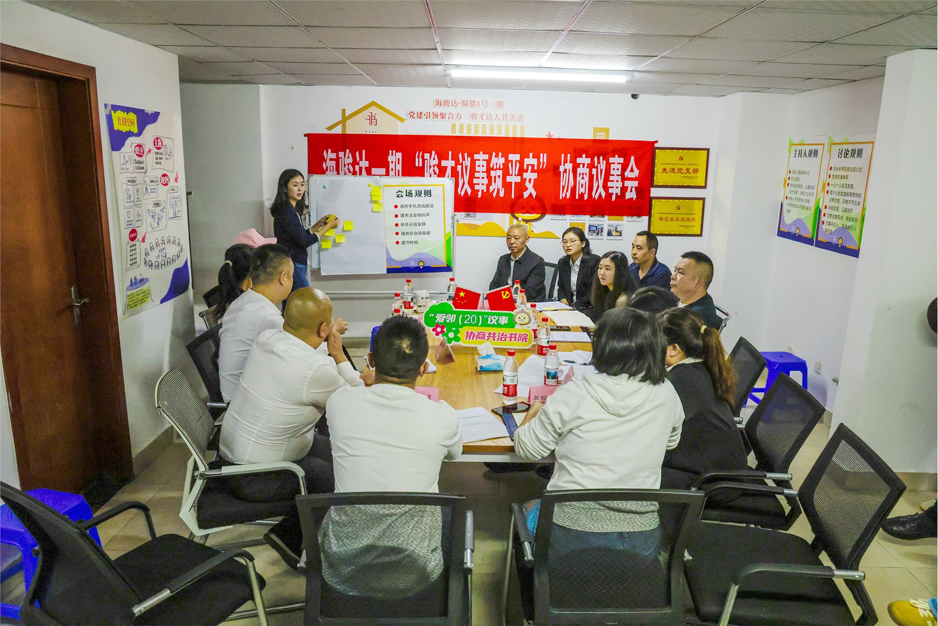 10月16日晚,海骏达一期小区党群服务站内灯火通明,一场聚焦“外墙瓷砖脱落修复”与“消防隐患整治”两大关乎居民生命财产安全议题的“爱邻20”协商议事会正在热烈进行。