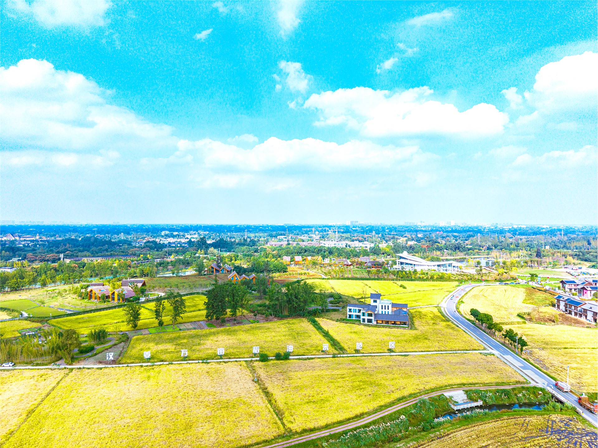 蝴蝶村乡村振兴示范片区如同一幅五彩“拼布”,蝶语馆的五彩蝶翼在田间舒展,湿地公园、商业街区、主题民宿等点缀其间,传统川西林盘与时尚消费场景同框,诠释着“公园+乡村”的郫都表达。