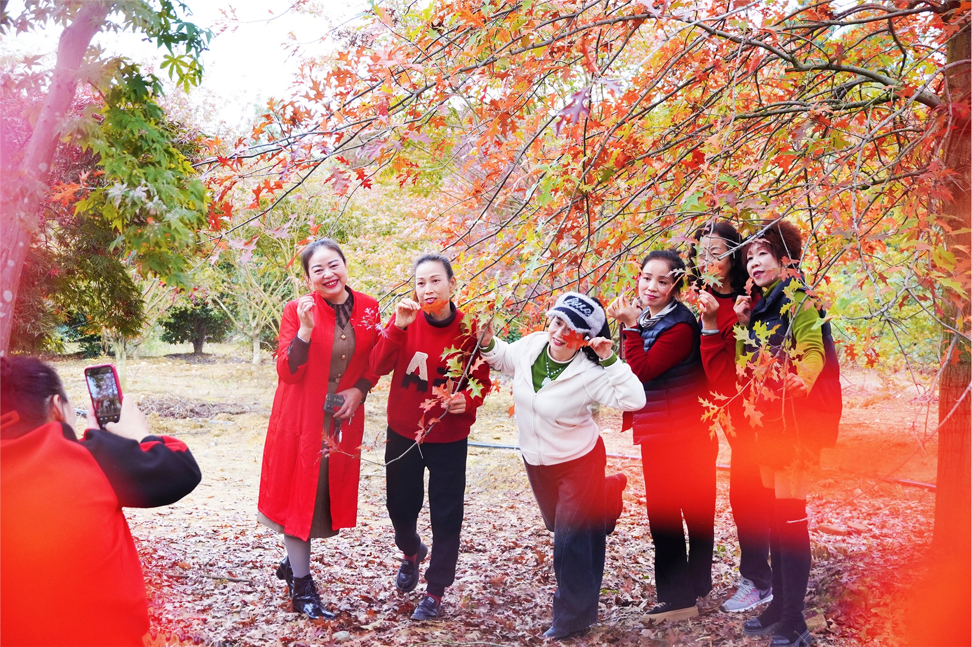 漫步林间,飘落的枫叶为大地铺就柔软“红毯”。市民游客或驻足树下,用镜头捕捉枫叶的灵动瞬间;或牵手家人漫步其间,踩着落叶感受初冬的温柔触感,欢声笑语在林间久久回荡。来自成都的杨雪不禁赞叹:“第一次来横山村,没想到这里的枫叶这么美,令人震撼,真是藏在‘深闺’的惊喜。”阿姨们在枫叶林中穿梭,裙摆与红叶共舞;摄影爱好者们架起“长枪短炮”,无人机穿梭其间,定格这层林尽染的绝美画面,“满山的枫叶,随手一拍都是大片!”