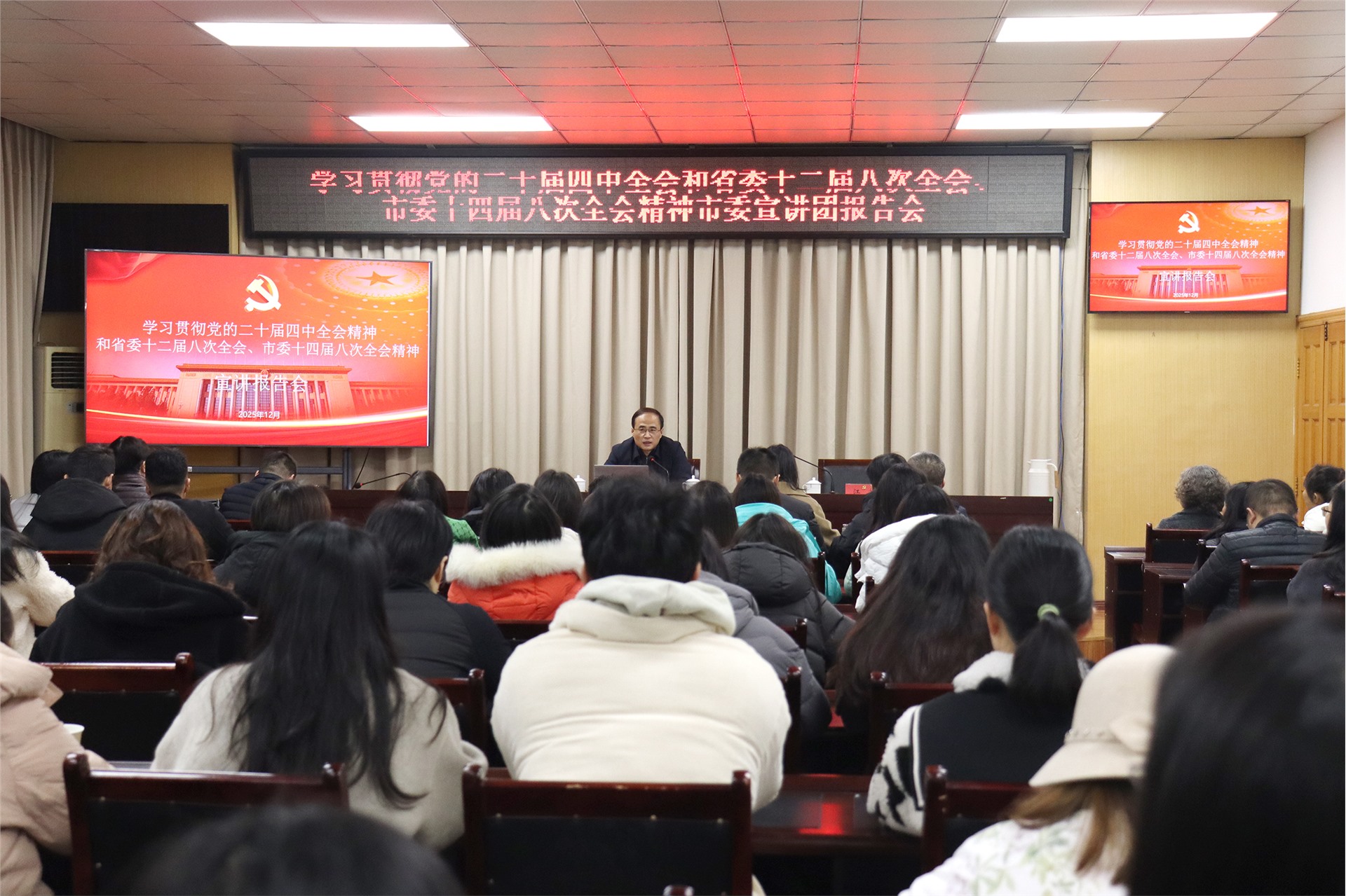 会议围绕党的二十届四中全会作出的重大部署和省委十二届八次全会、市委十四届八次全会工作要求,为与会人员深入阐述了“十五五”时期在基本实现社会主义现代化进程中的重要地位,“十五五”时期经济社会发展的指导方针、主要目标和战略任务等具体内容。报告解读权威全面,现场反响热烈。