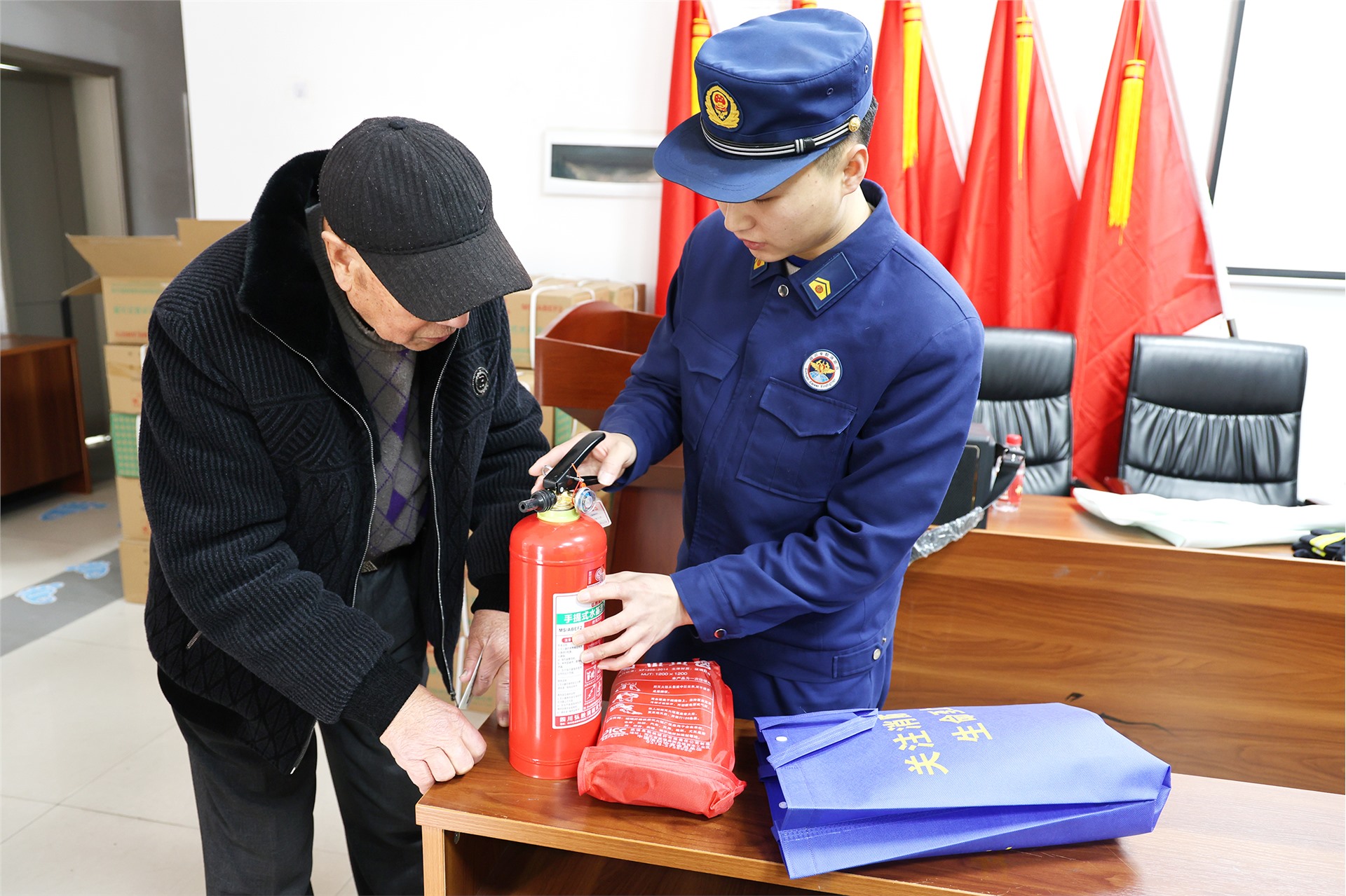 “你们想得太周到了,不仅送了我们这么实用的消防安全应急包,还手把手教我们使用,有了这些消防器材,这下心里可踏实多了……”1月5日在文庙社区党群服务中心,老人们接过消防员送来的小型灭火器、灭火毯等器材,脸上写满了感激。除了发放消防器材,现场还进行了消防安全知识培训,消防员从如何正确铺设灭火毯、覆盖火源,到灭火器“提、拔、握、压”4步操作法,都进行了耐心细致的讲解,确保每位获赠者都能熟练掌握操作要领,有效提升特殊群体在初起火灾发生时的自救互救能力。