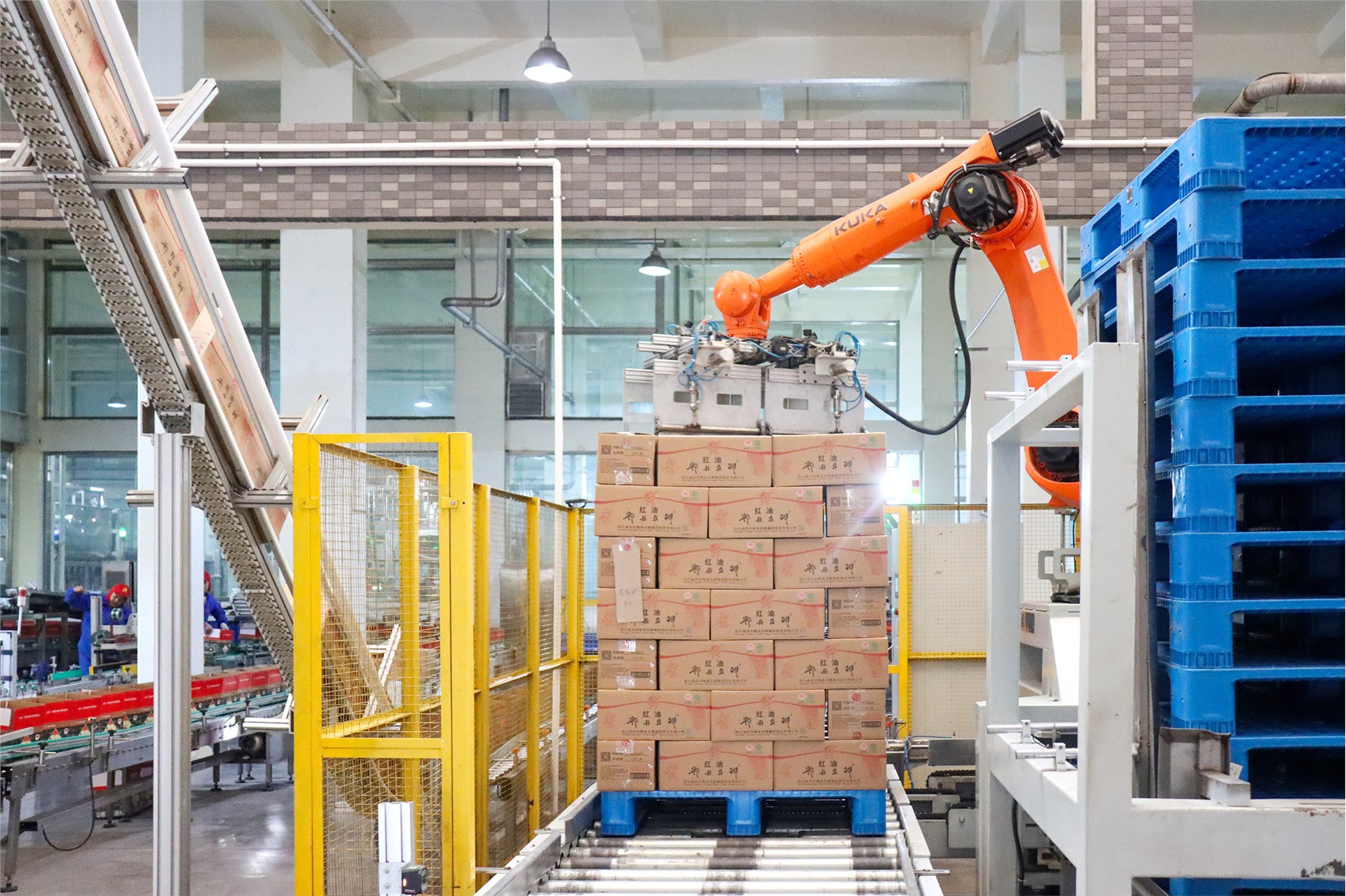 在丹丹豆瓣的智能仓储区内,原本平面的仓库变成了立体4层,大屏上实时可见各项数据;AGV小车来回穿梭,将刚下线的产品运往智慧仓储入库口;随后,货物被RGV和提升机搬运到指定位置。