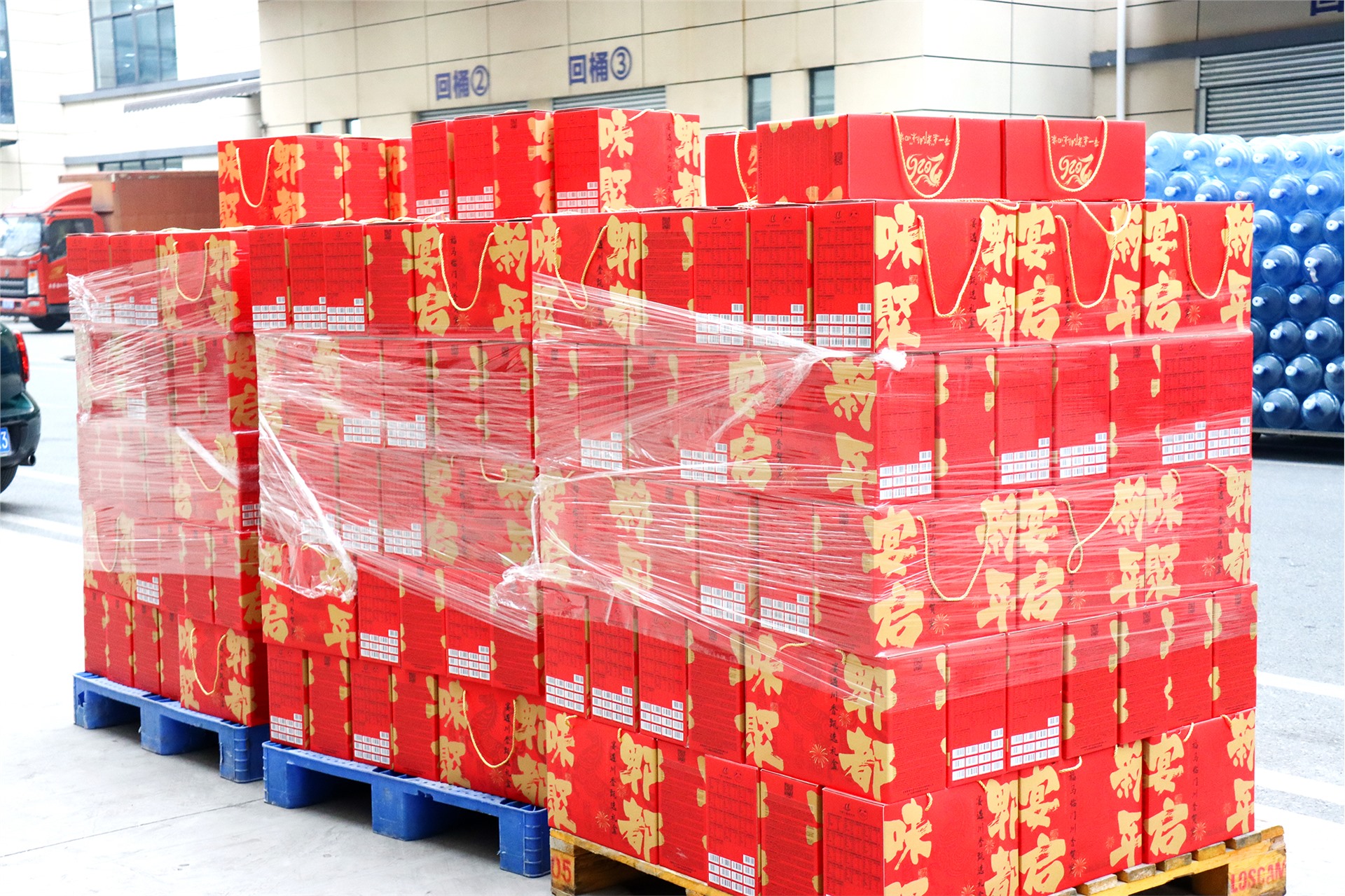 车间里,工人们分工明确、动作娴熟:有的小心翼翼地将鹃城豆瓣、饭扫光坚果油辣子等13款明星产品逐一装入礼盒,有的仔细核对产品清单确保无遗漏,有的快速封装,还有的将打包好的礼盒整齐码放至托盘,等待物流车辆转运。不多时,一个个红彤彤的礼盒便堆起了层层“小山”,处处洋溢新春的喜庆氛围。